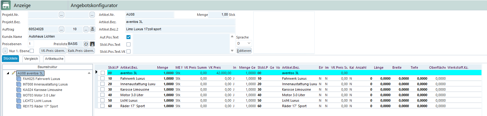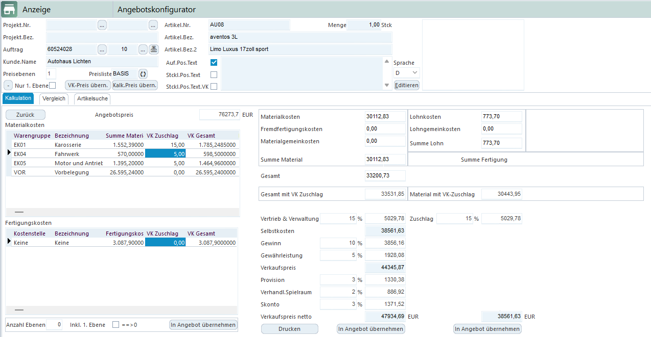 AvERP bietet Ihnen die Möglichkeit, jedes Angebot und jeden Auftrag individuell zu konfigurieren. Durch den integrierten Angebotskonfigurator in den einzelnen Positionen, haben Sie die Möglichkeit schon vorab verschiedene Stücklistenvarianten zu berechnen, anzupassen und zu vergleichen um Ihrem Kunden ein maßgeschneidertes Angebot zukommen zu lassen.